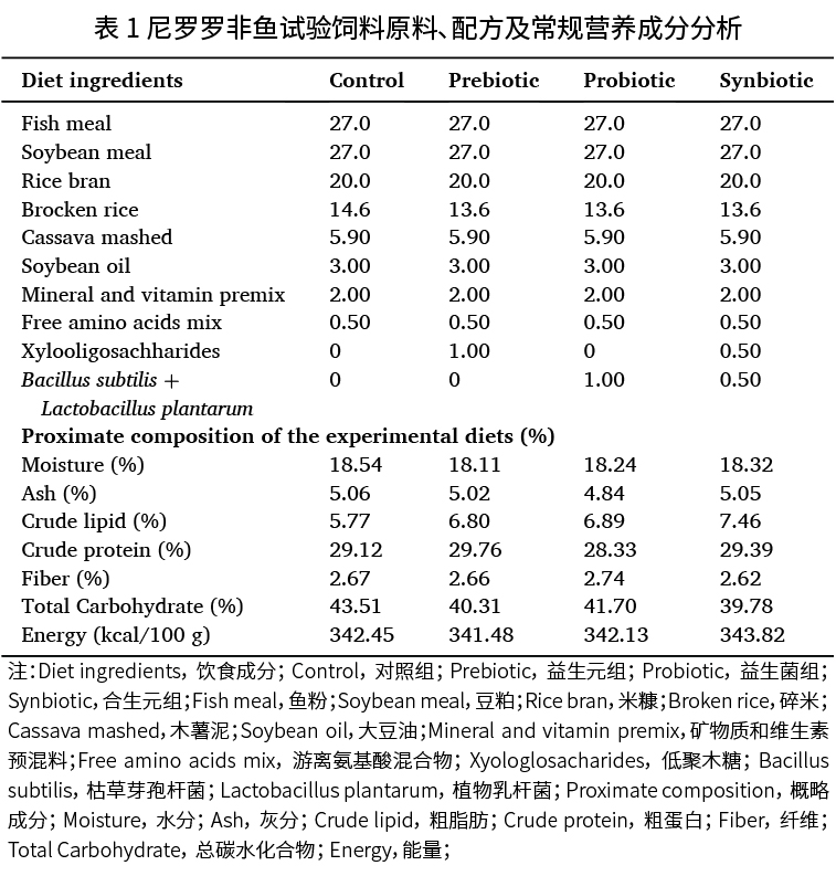试验目的 本研究旨在探究低聚木糖(XOS)对尼罗罗非鱼生长性能、鱼肉品质、健康状况及抗病性的影响。 试验设计 本次试验共设置了4个饲料处理组:对照组(基础饲料)、XOS组(添加 1% XOS)、益生菌组(添加 0.5% 枯草芽孢杆菌+ 0.5% 植物乳杆菌)、合生元组(添加 0.5% XOS + 0.5% 益生菌剂)(表 1)。饲喂试验共设置12个网箱,每个网箱投放30尾试验鱼。在整个试验周期(56天)内,每天上午 8:00 和下午 17:00,采用人工投喂方式向各组试验鱼分别投喂4种试验饲料(每组 3 个重复),投喂量以鱼群达到表观饱食状态为准。试验期间严格对水质参数进行持续监测。