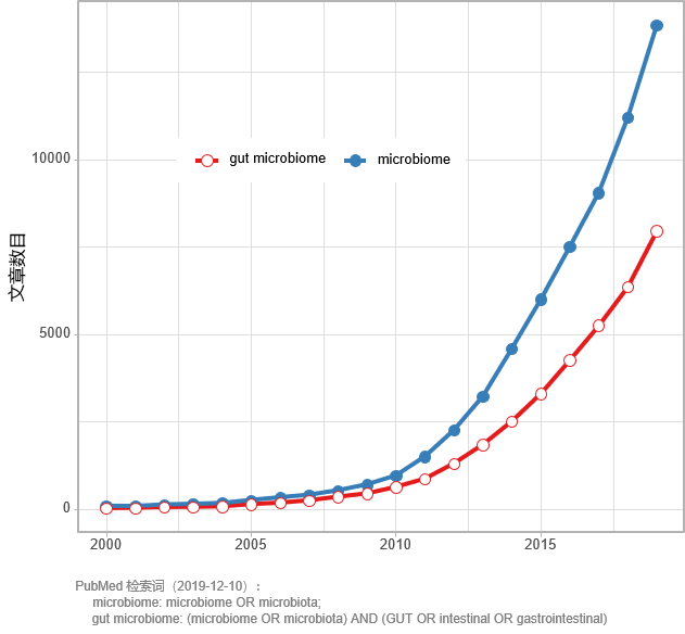 而在过往 13 年,PubMed 中每年收录的“菌群”研究文献的数目,从2006年的 300 余篇增长到 2018 年的 11000 余篇,增长 30 多倍。截止到 12 月 12 日,2019 年 PubMed 收录的相关文献已达 13800 余篇,预计全年会超过 15000 篇。
