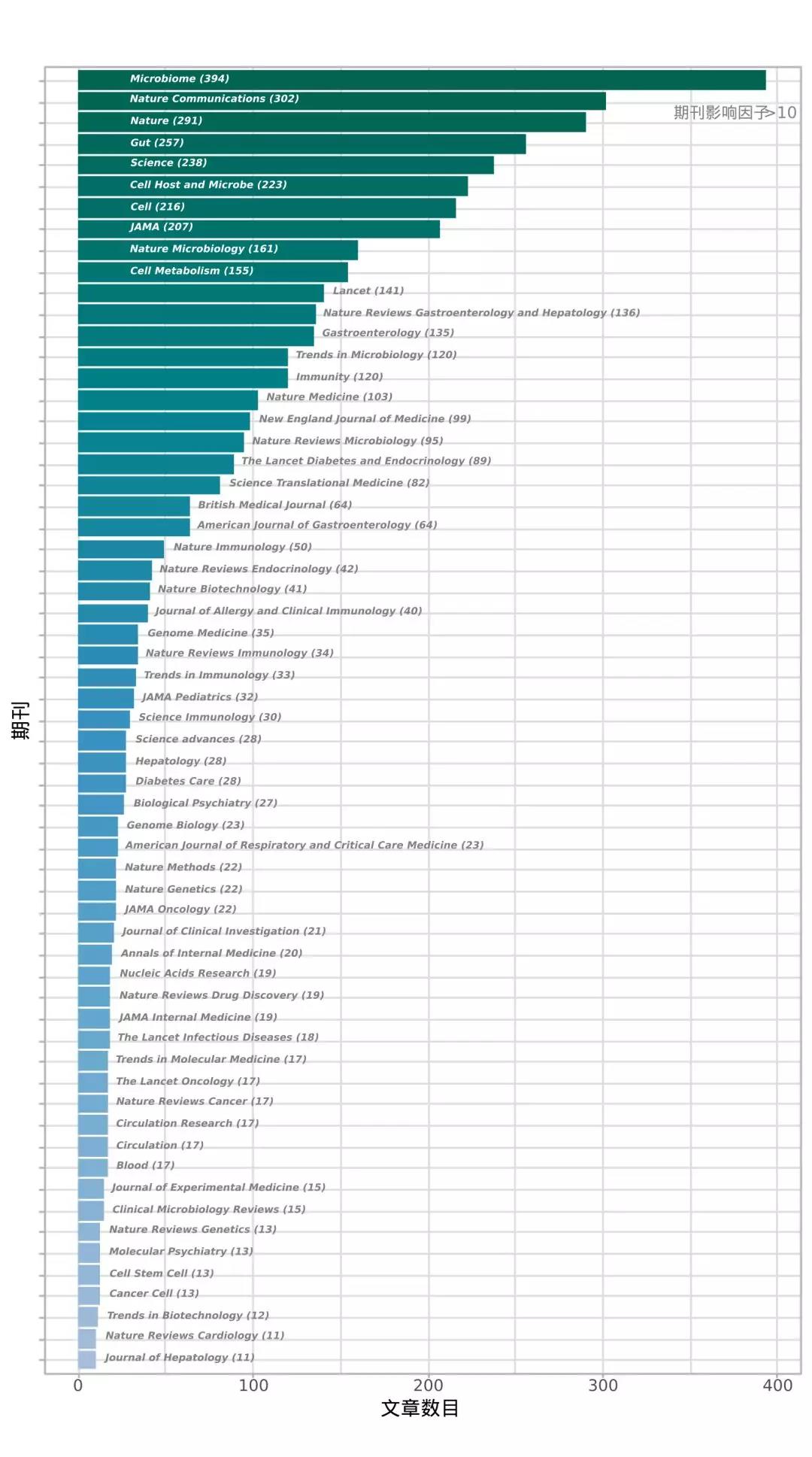 在生命科学领域最受关注的《自然》、《科学》、《细胞》、《美国医学会杂志》、《柳叶刀》和《新英格兰医学杂志》也在持续发表肠道菌群相关的重要研究突破,它们被收录的文献数目分别高达 291、238、216、207、141 和 99 篇。