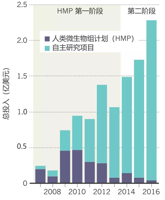 这其中以美国国立卫生研究院(NIH)的人类微生物组计划(HMP)最为人熟知。在 2007-2016 年间,NIH 在人类微生物组计划中累计投入了 2.15 亿美元[8](图4)。2012-2016 年,NIH 在 HMP 之外又投入了 7.28 亿美元用于人类微生物组领域的其它研究[9]。