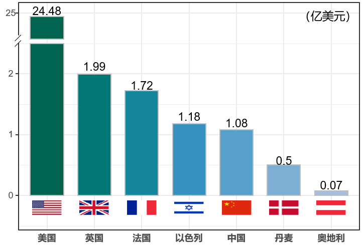 与此同时,肠道菌群相关的产业转化也在持续发展,菌群及相关生物技术公司的成立如雨后春笋,资金投入也越来越大。截止到 2019 年,全球有超过 30 亿美元投入到肠道菌群相关创新公司(图6)。与基础研究情况类似,美国以超过 24 亿美元投资一马当先,其他国家正迎头追赶。